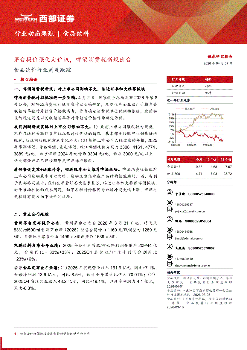 食品飲料行業(yè):西部證券-食品飲料行業(yè)周度跟蹤:茅臺(tái)提價(jià)強(qiáng)化定價(jià)權(quán),啤酒消費(fèi)稅新規(guī)出臺(tái)-260407