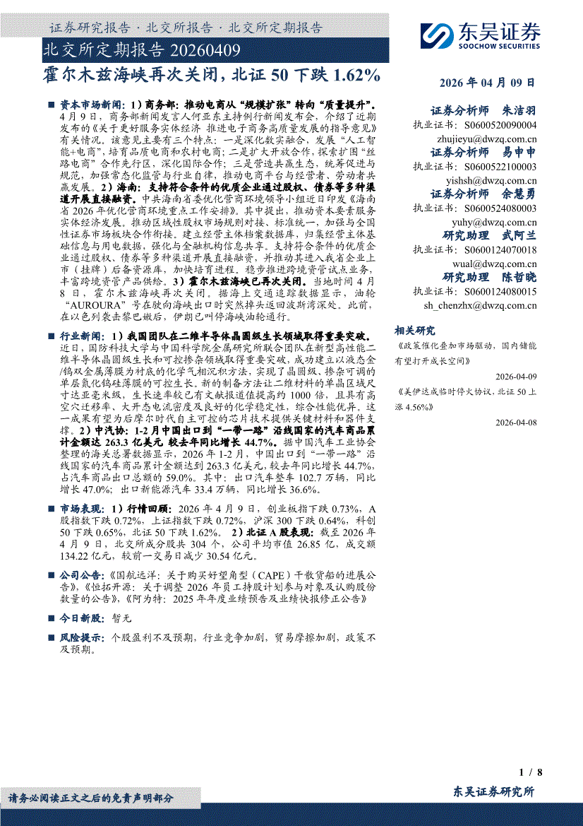 東吳證券-北交所定期報告:霍爾木茲海峽再次關(guān)閉,北證50下跌1.62%-260409