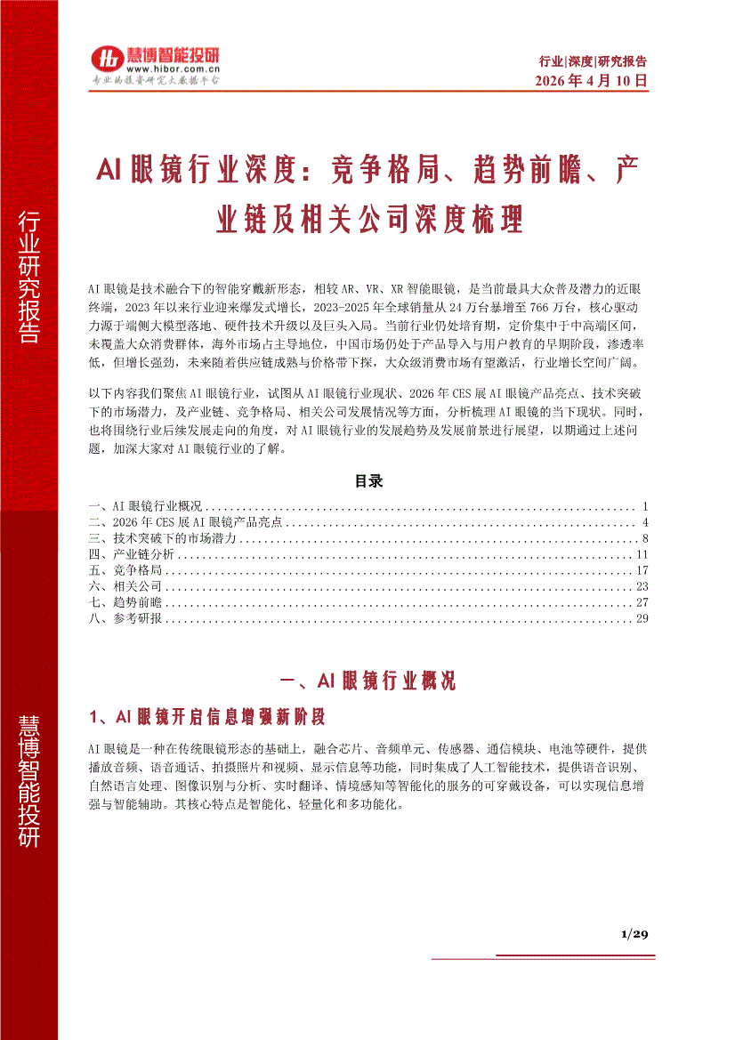 AI眼鏡行業(yè):慧博智能投研-AI眼鏡行業(yè)深度:競爭格局、趨勢前瞻、產(chǎn)業(yè)鏈及相關(guān)公司深度梳理-260410