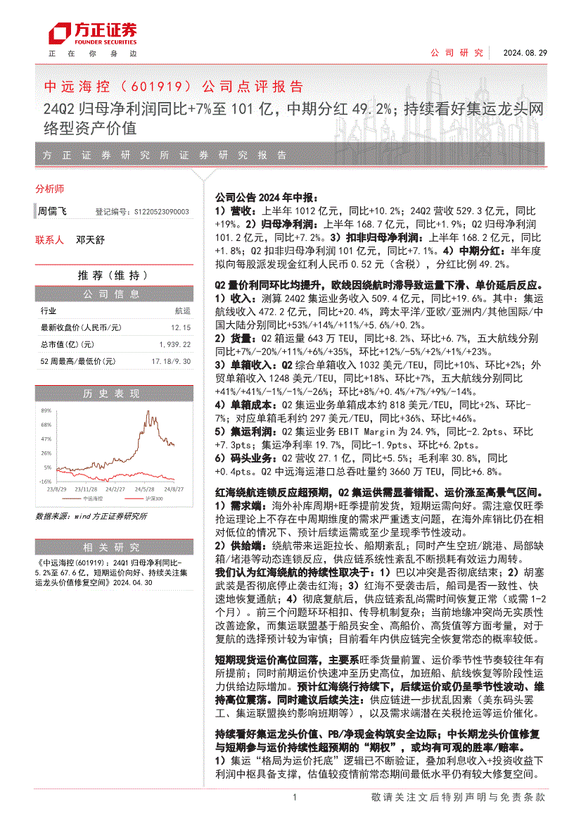 中遠??兀悍秸C券-中遠???601919-公司點評報告:24Q2歸母凈利潤同比+7%至101億,中期分紅49.2%;持續(xù)看好集運龍頭網(wǎng)絡型資產(chǎn)價值-240829