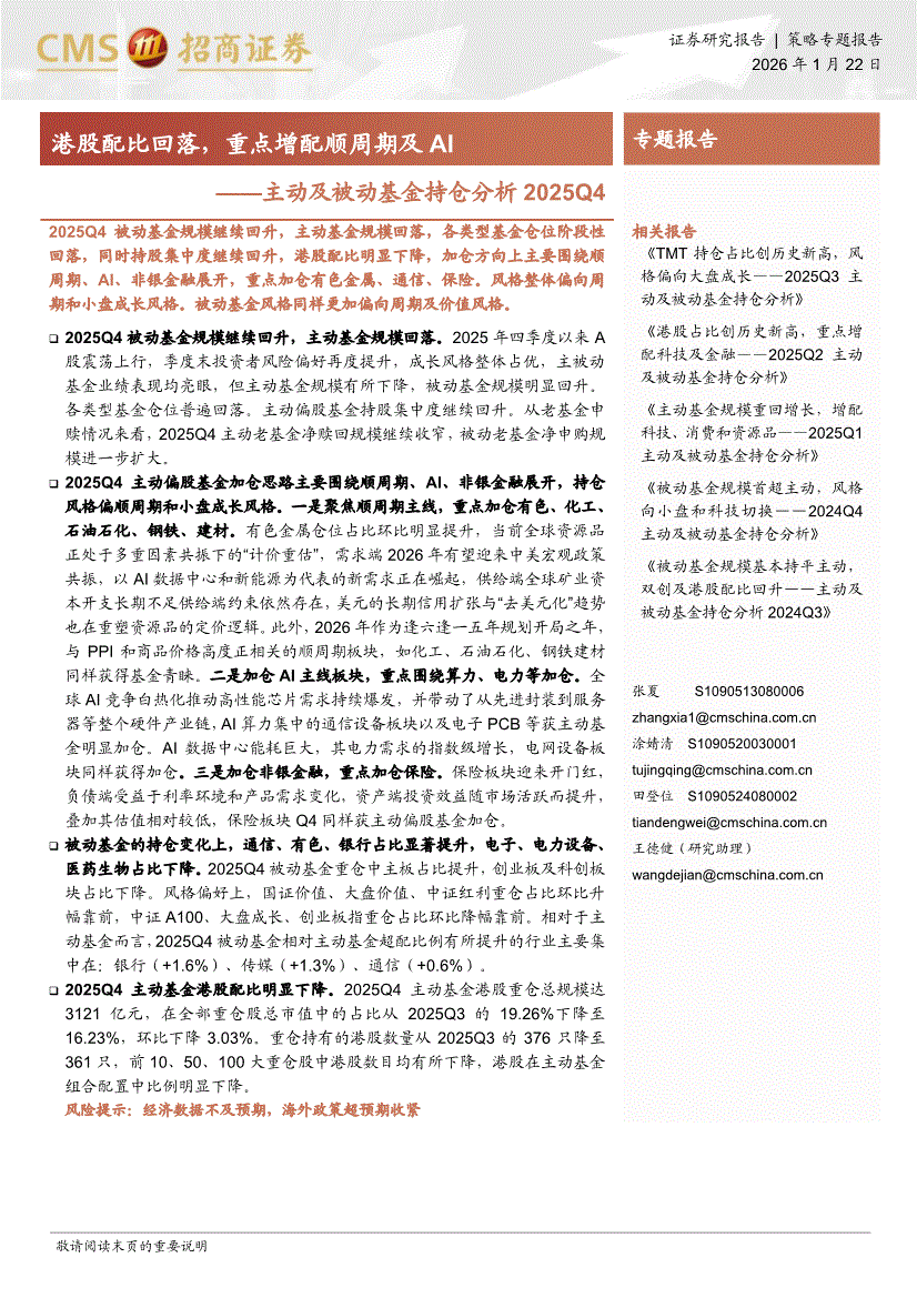 招商證券-2025Q4主動及被動基金持倉分析:港股配比回落,重點(diǎn)增配順周期及AI-260122