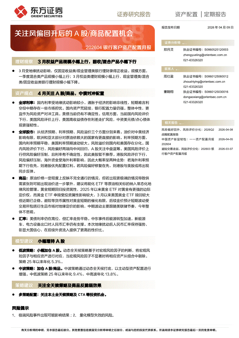 東方證券-202604銀行客戶資產(chǎn)配置月報:關(guān)注風(fēng)偏回升后的A股/商品配置機(jī)會-260409