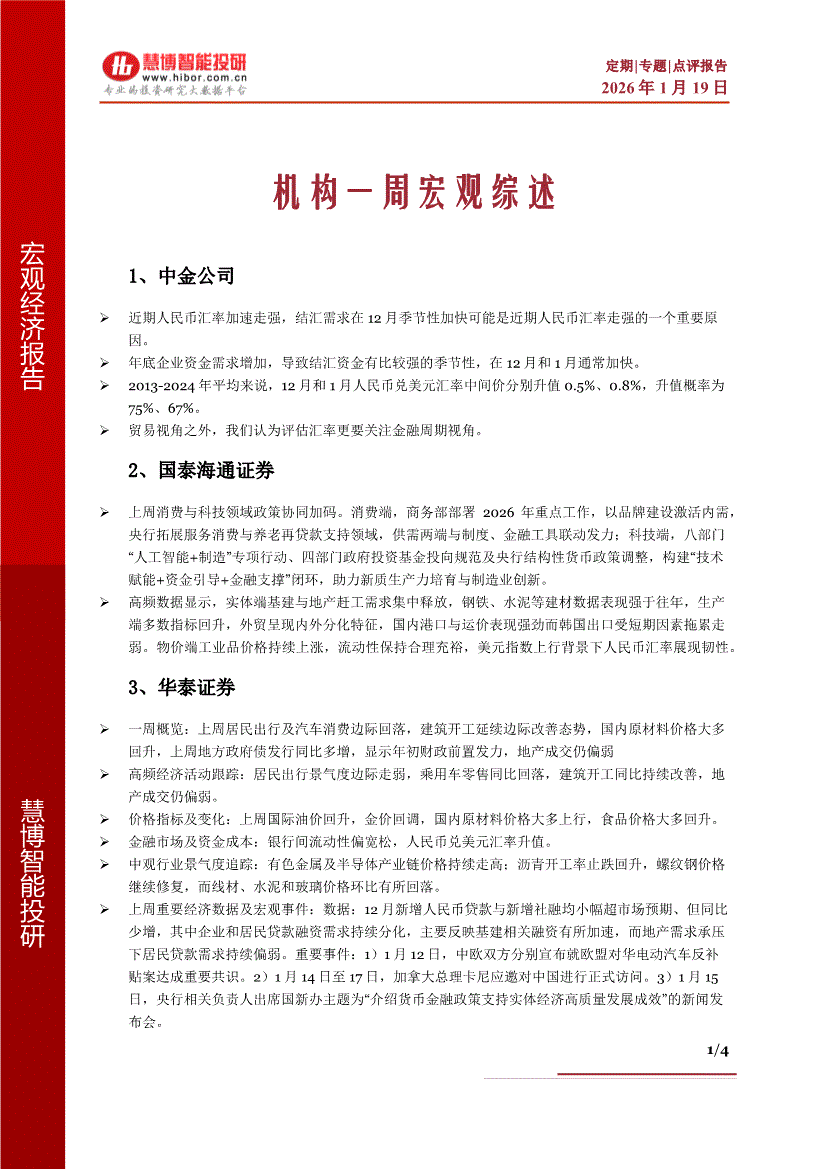 慧博智能投研-機(jī)構(gòu)一周宏觀綜述-260119