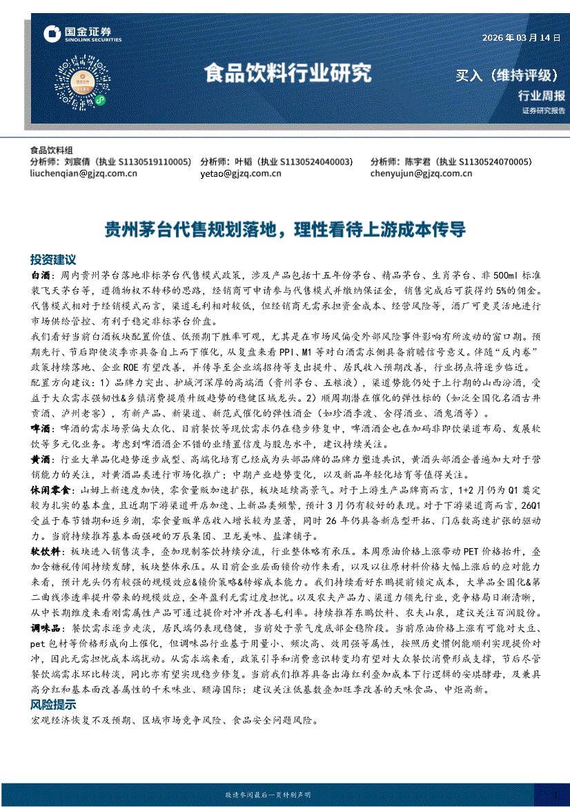 食品飲料行業(yè):國金證券-食品飲料行業(yè)周報:貴州茅臺代售規(guī)劃落地,理性看待上游成本傳導(dǎo)-260314