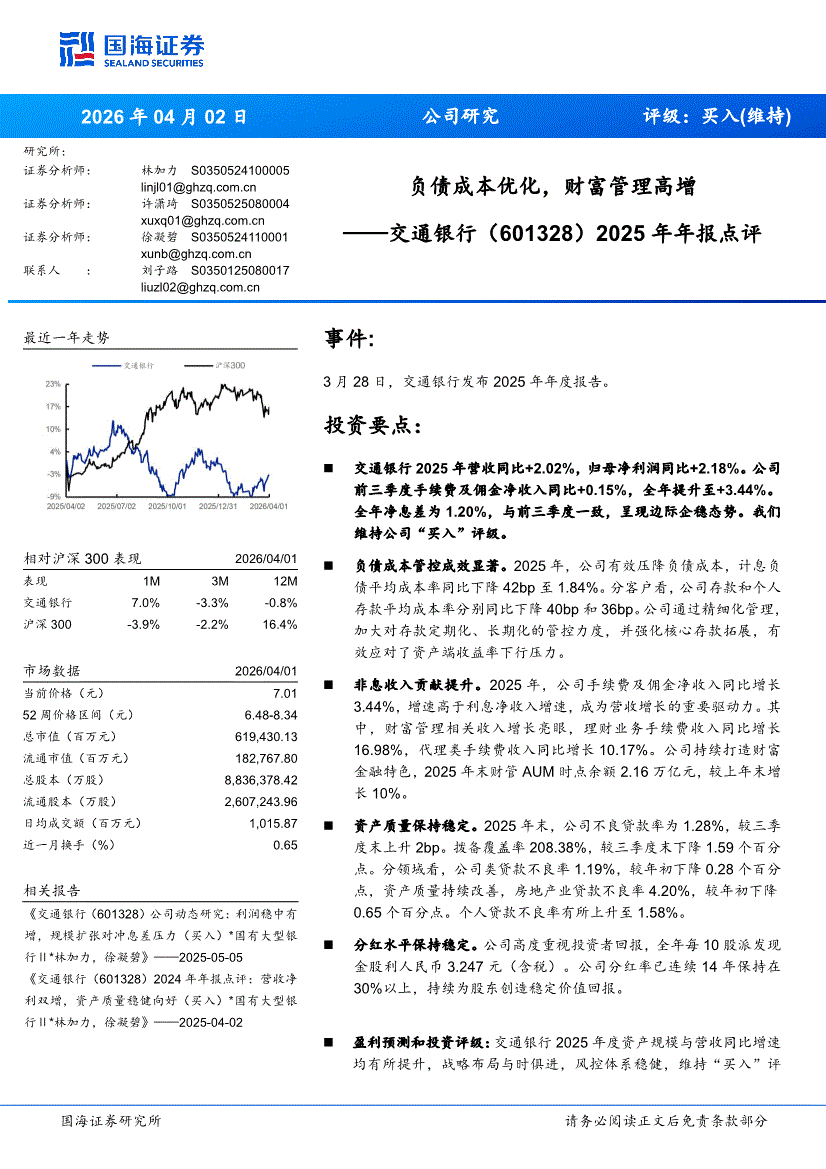 交通銀行:國(guó)海證券-交通銀行-601328-2025年年報(bào)點(diǎn)評(píng):負(fù)債成本優(yōu)化,財(cái)富管理高增-260402