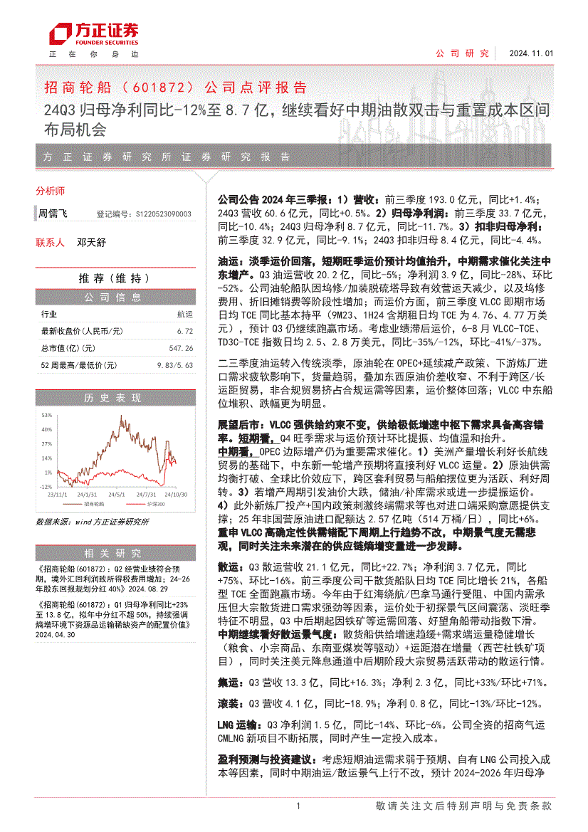招商輪船:方正證券-招商輪船-601872-公司點(diǎn)評(píng)報(bào)告:24Q3歸母凈利同比減少12%至8.7億,繼續(xù)看好中期油散雙擊與重置成本區(qū)間布局機(jī)會(huì)-241101