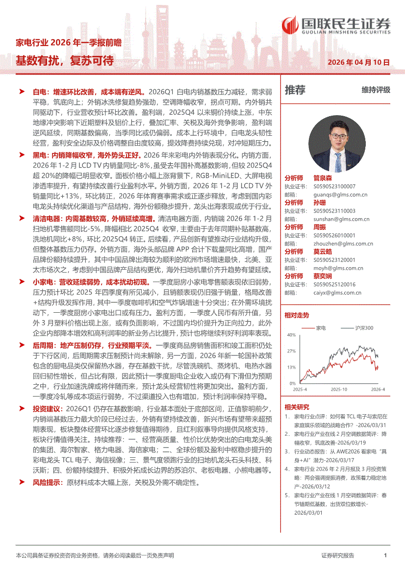 家電行業(yè):國聯(lián)民生證券-家電行業(yè)2026年一季報(bào)前瞻:基數(shù)有擾,復(fù)蘇可待-260410