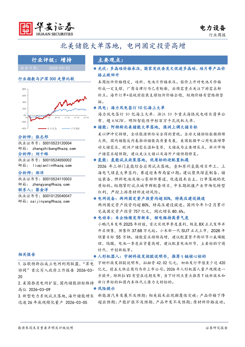 電力設(shè)備行業(yè):華安證券-電力設(shè)備行業(yè)周報:北美儲能大單落地,電網(wǎng)固定投資高增-260323