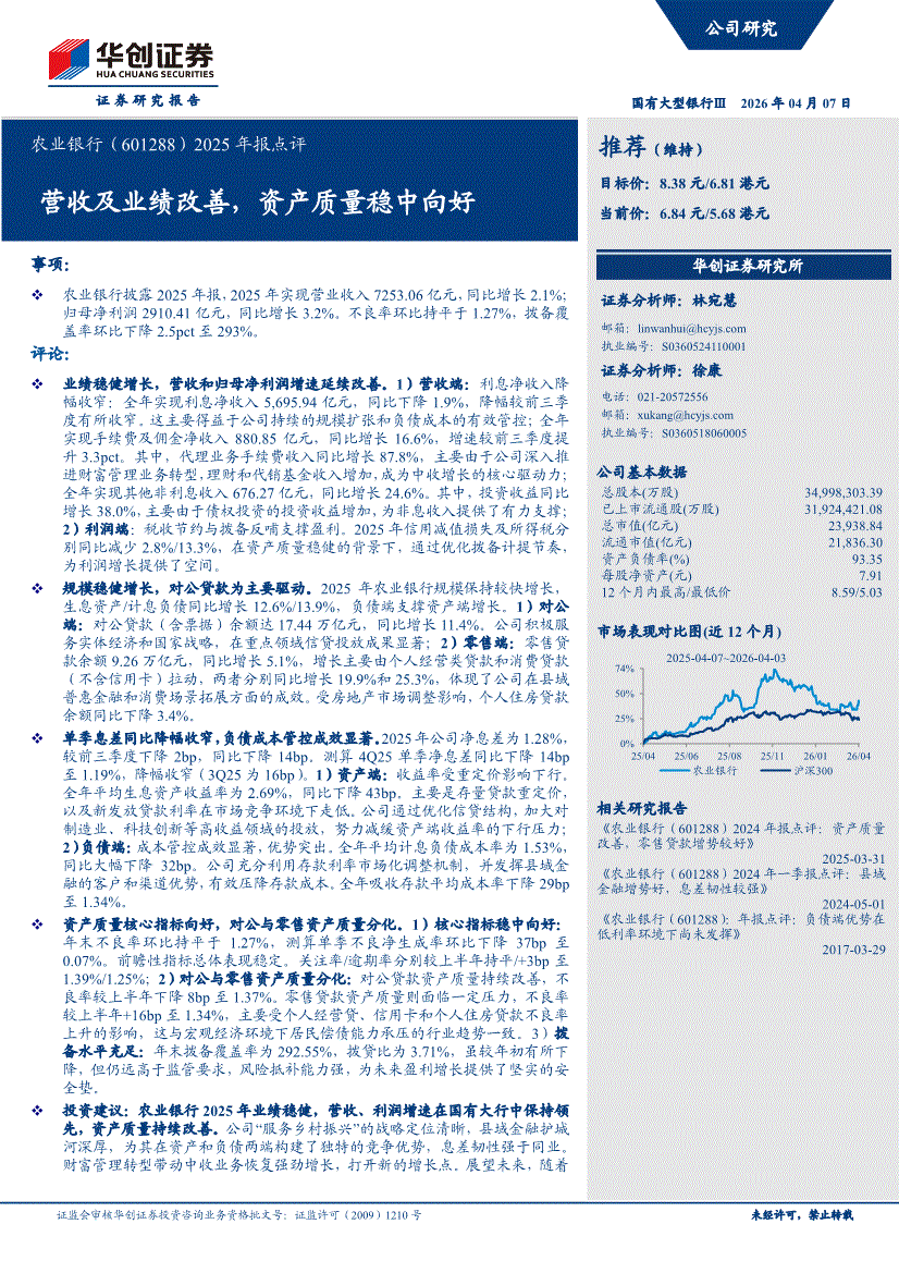 農(nóng)業(yè)銀行:華創(chuàng)證券-農(nóng)業(yè)銀行-601288-2025年報點評:營收及業(yè)績改善,資產(chǎn)質(zhì)量穩(wěn)中向好-260407
