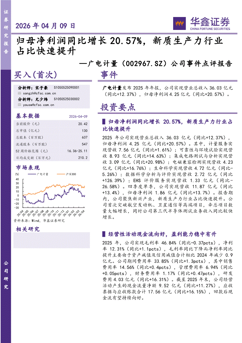 廣電計量:華鑫證券-廣電計量-002967-公司事件點評報告:歸母凈利潤同比增長20.57%,新質生產(chǎn)力行業(yè)占比快速提升-260409