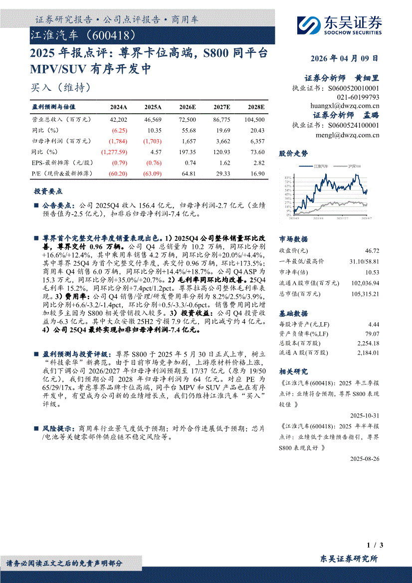 江淮汽車(chē):東吳證券-江淮汽車(chē)-600418-2025年報(bào)點(diǎn)評(píng):尊界卡位高端,S800同平臺(tái)MPV/SUV有序開(kāi)發(fā)中-260409