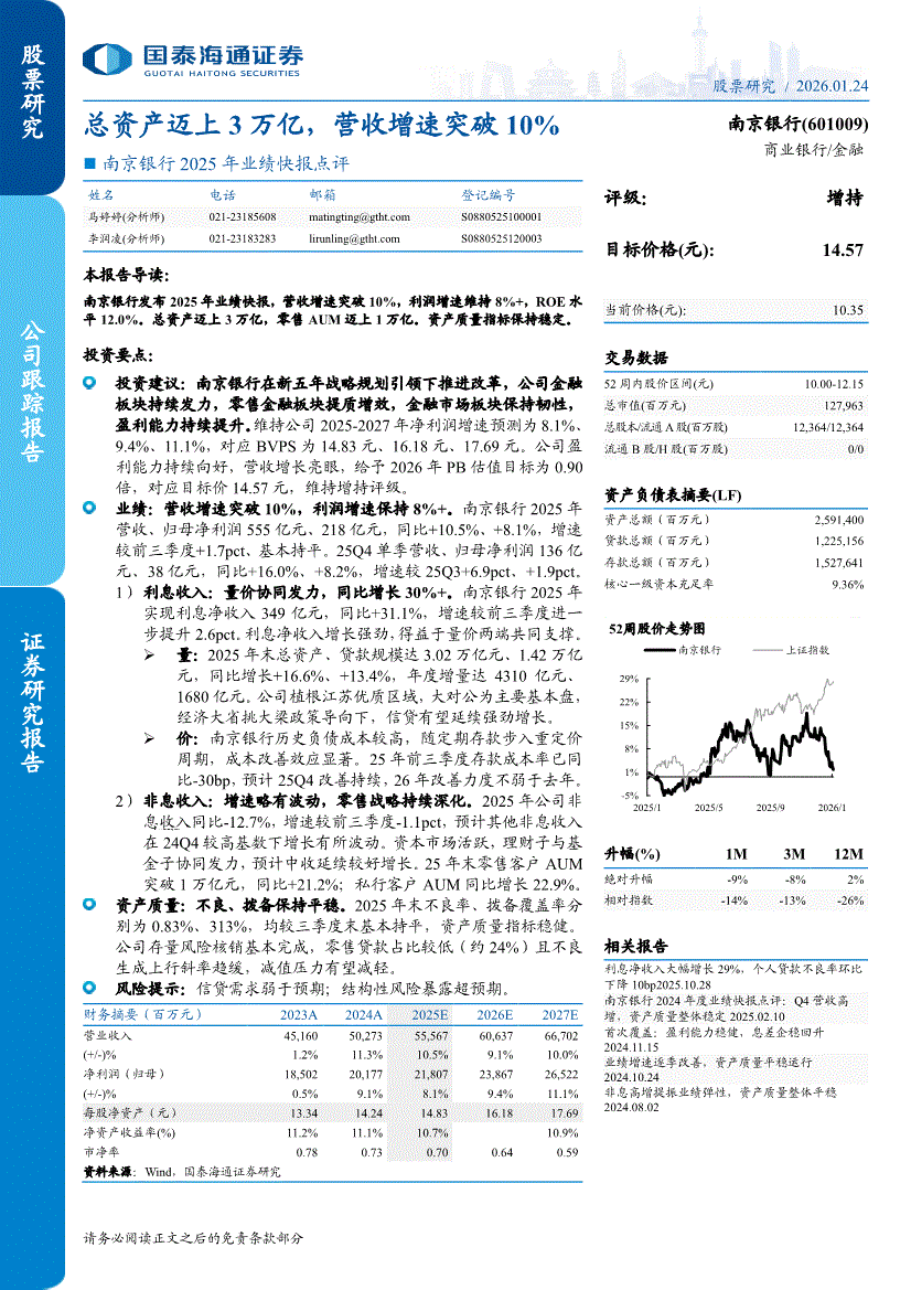 南京銀行:國泰海通證券-南京銀行-601009-2025年業(yè)績快報(bào)點(diǎn)評(píng):總資產(chǎn)邁上3萬億,營收增速突破10%-260124
