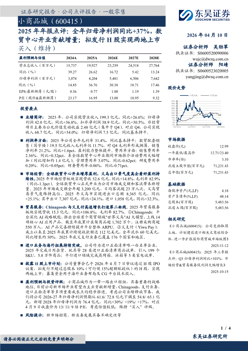 小商品城:東吳證券-小商品城-600415-2025年年報(bào)點(diǎn)評(píng):全年歸母凈利潤(rùn)同比+37%,數(shù)貿(mào)中心開業(yè)貢獻(xiàn)增量;擬發(fā)行H股實(shí)現(xiàn)兩地上市-260410