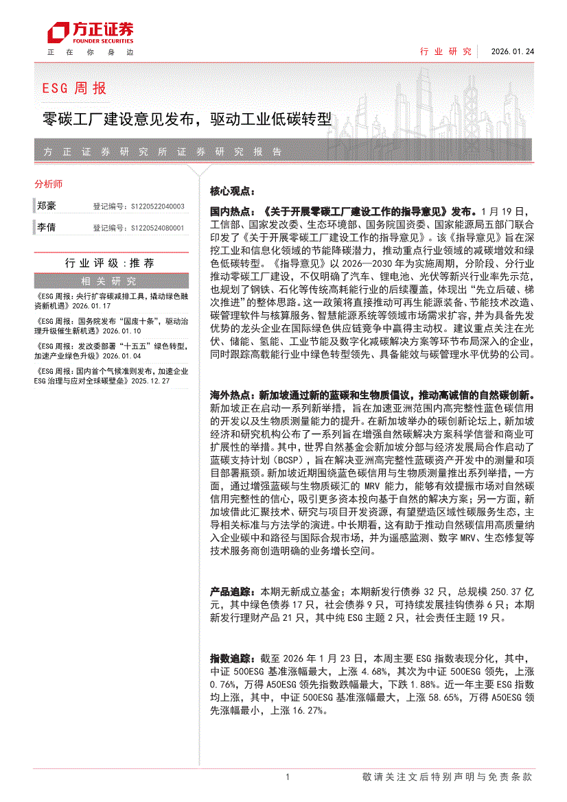 ESG行業(yè):方正證券-ESG行業(yè)周報:零碳工廠建設意見發(fā)布,驅動工業(yè)低碳轉型-260124