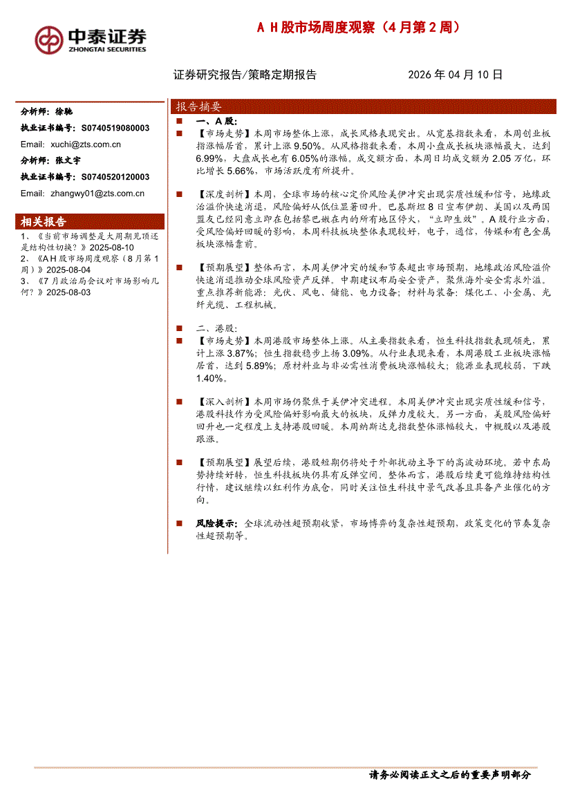 中泰證券-A H股市場(chǎng)周度觀察(4月第2周)-260410