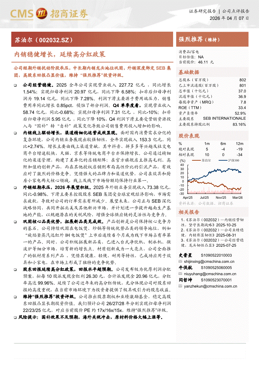蘇泊爾:招商證券-蘇泊爾-002032-內(nèi)銷穩(wěn)健增長,延續(xù)高分紅政策-260407