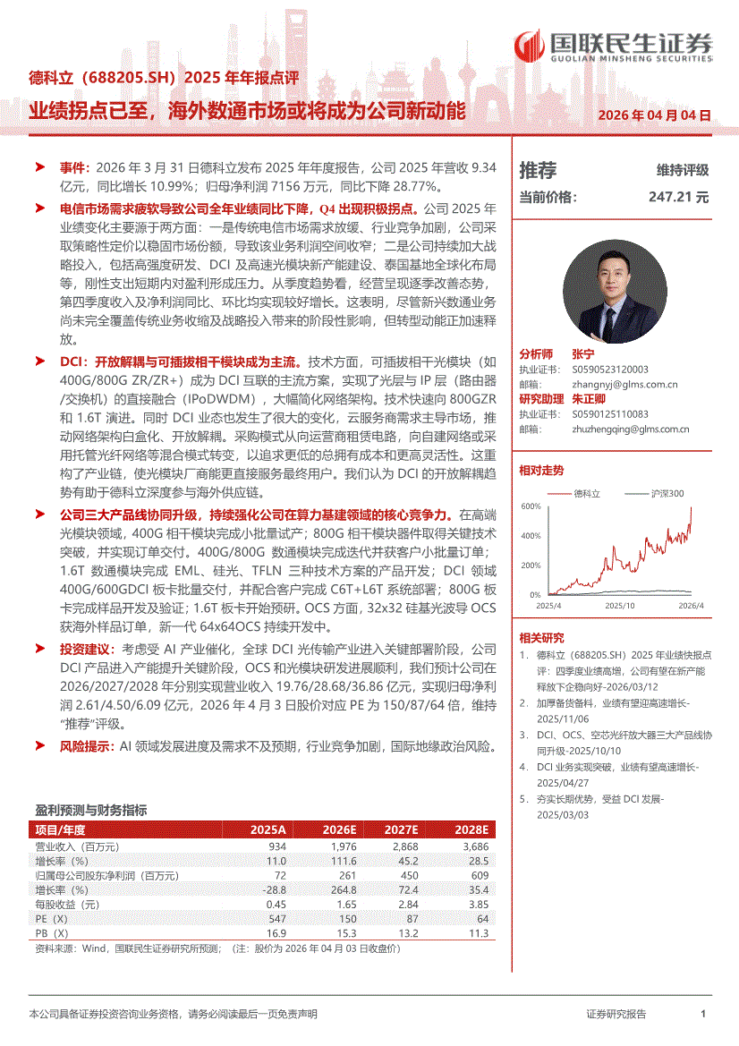 德科立:國聯(lián)民生證券-德科立-688205-2025年年報(bào)點(diǎn)評(píng):業(yè)績(jī)拐點(diǎn)已至,海外數(shù)通市場(chǎng)或?qū)⒊蔀楣拘聞?dòng)能-260404